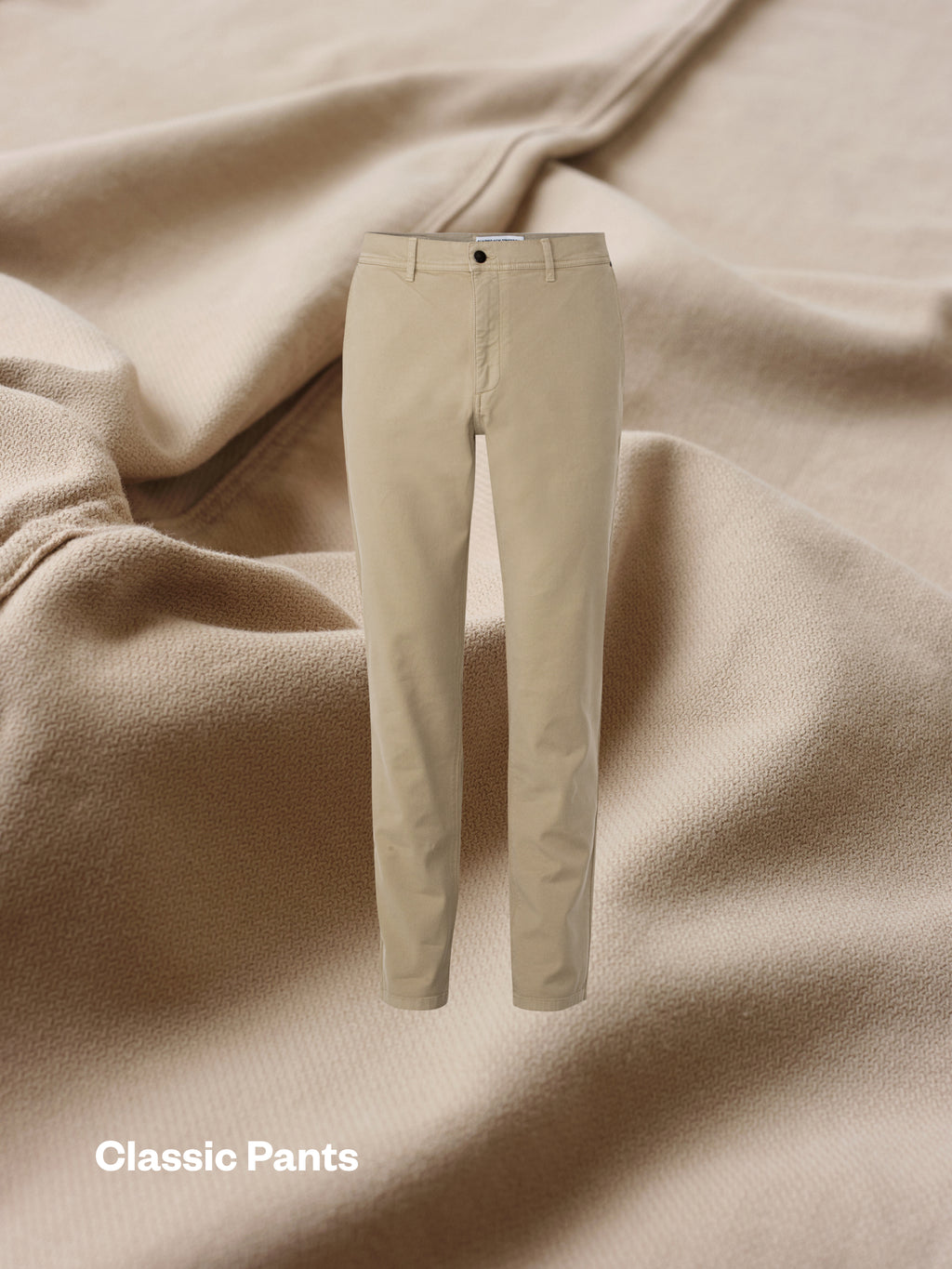 Hvis du elsker ekstra komfort og ikke vil have at dine bukser skal begrænse dig i dine aktiviteter, så er Classic Pants perfekte til dig. Disse klassiske chinos er lavet af blød Pima bomuld i høj kvalitet. Og fordi den bløde bomuld ikke var nok for os, har vi udviklet en FreeFiberTM teknologi, der skaber et innovativt stræk i stoffet, der tilpasser sig enhver bevægelse, holder formen og er utrolig blødt. Du kan også vælge mellem slim fit og regular fit – alt afhængig af din kropstype og smag.