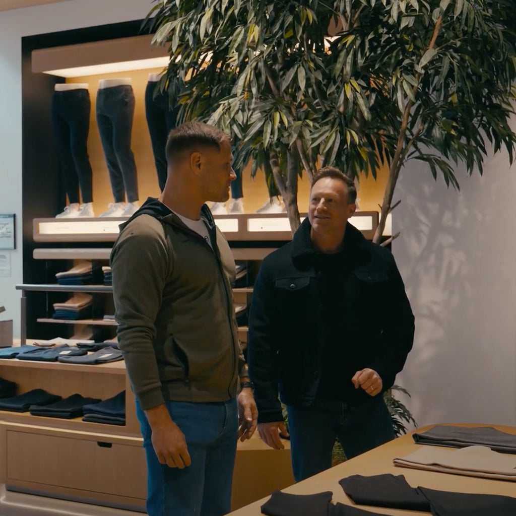 Jakkesættet er “utroligt holdbart, utroligt fleksibelt, du kan virkelig gøre hvad som helst i det,” siger den tyske verdensmester i håndbold Michael “Mimi” Kraus til sin ven Markus Ertelt, skuespiller og fitnessekspert.