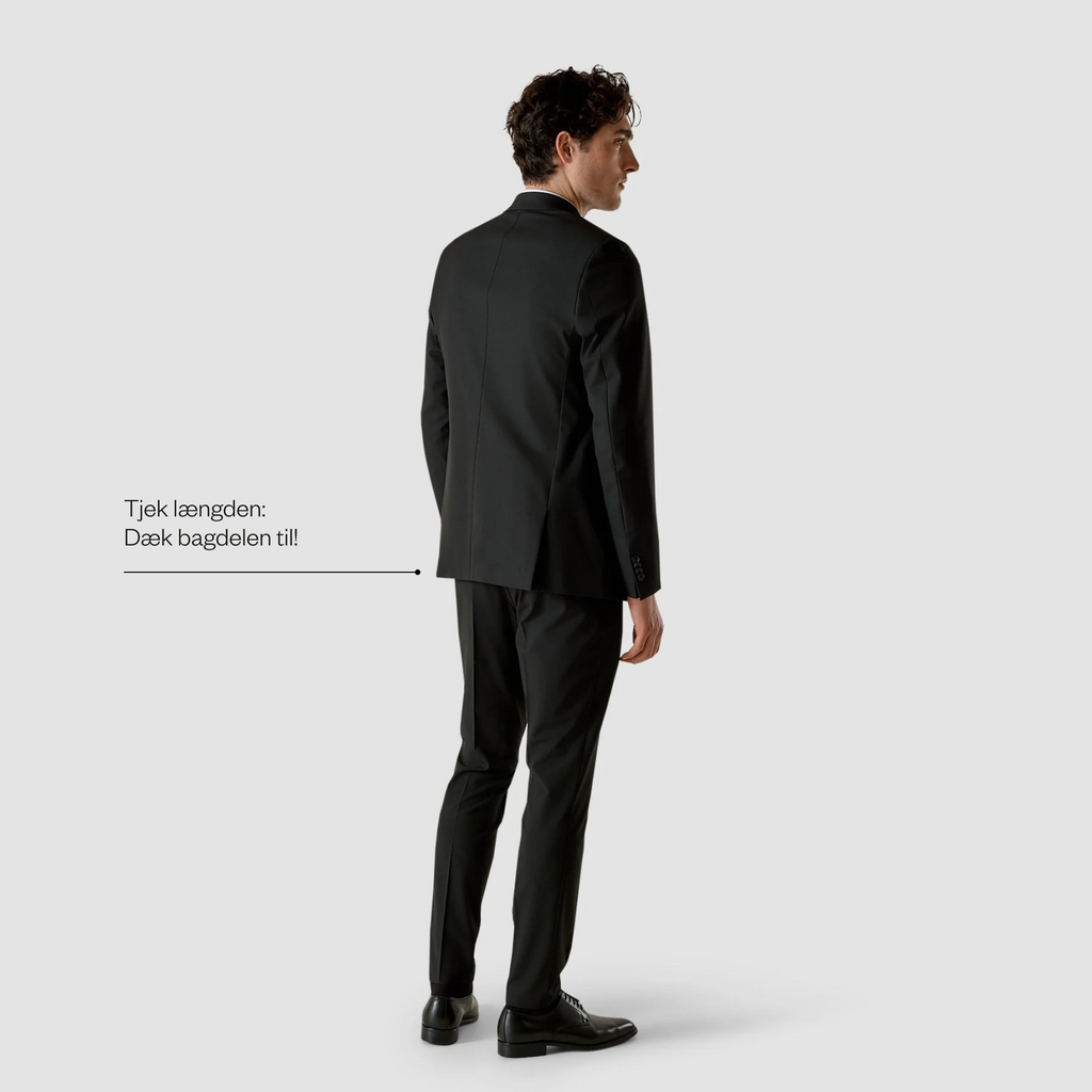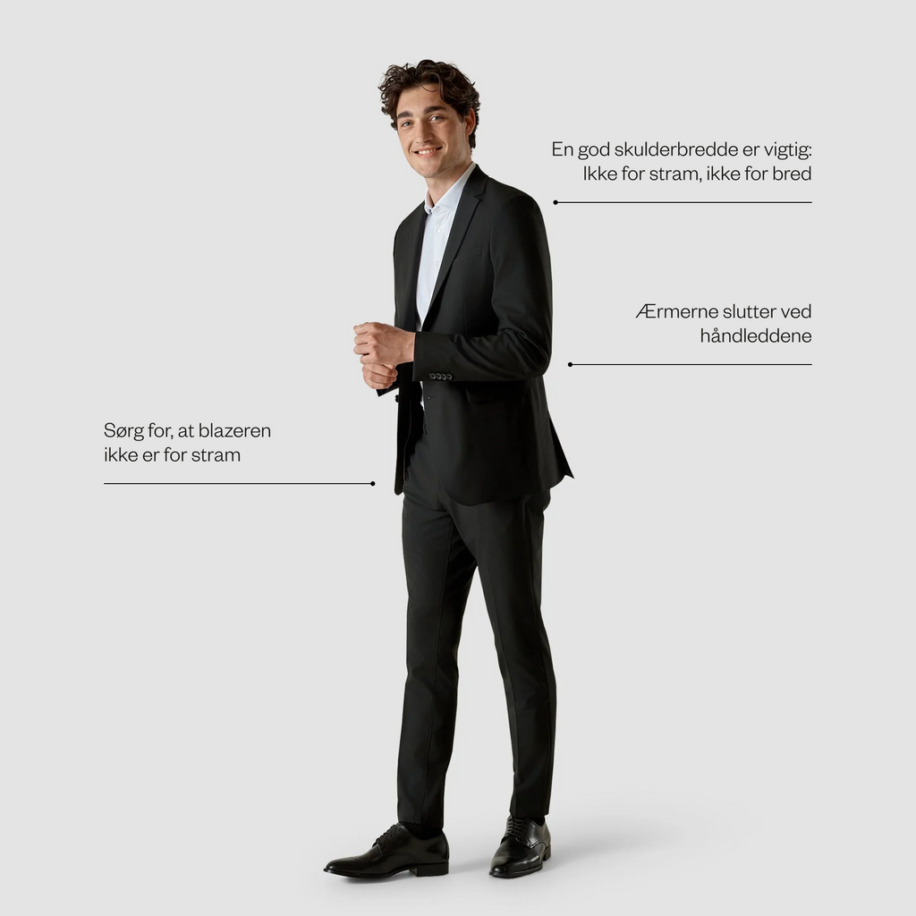 Du synes måske, det er svært at afgøre om din blazer eller dit jakkesæt sidder godt – især, hvis du ikke bruger det så ofte. Og når det kommer til stykket, er der ikke noget vigtigere end at finde den perfekte pasform. Tjek først og fremmest om længden er rigtig: den skal gå ned over din bagdel. Sørg også for at blazeren ikke er for tight. Du kan nemt se om, der er rynker ved knapperne, hvis den sidder for stramt. Og når vi nu er ved knapperne: den nederste skal altid være knappet op!