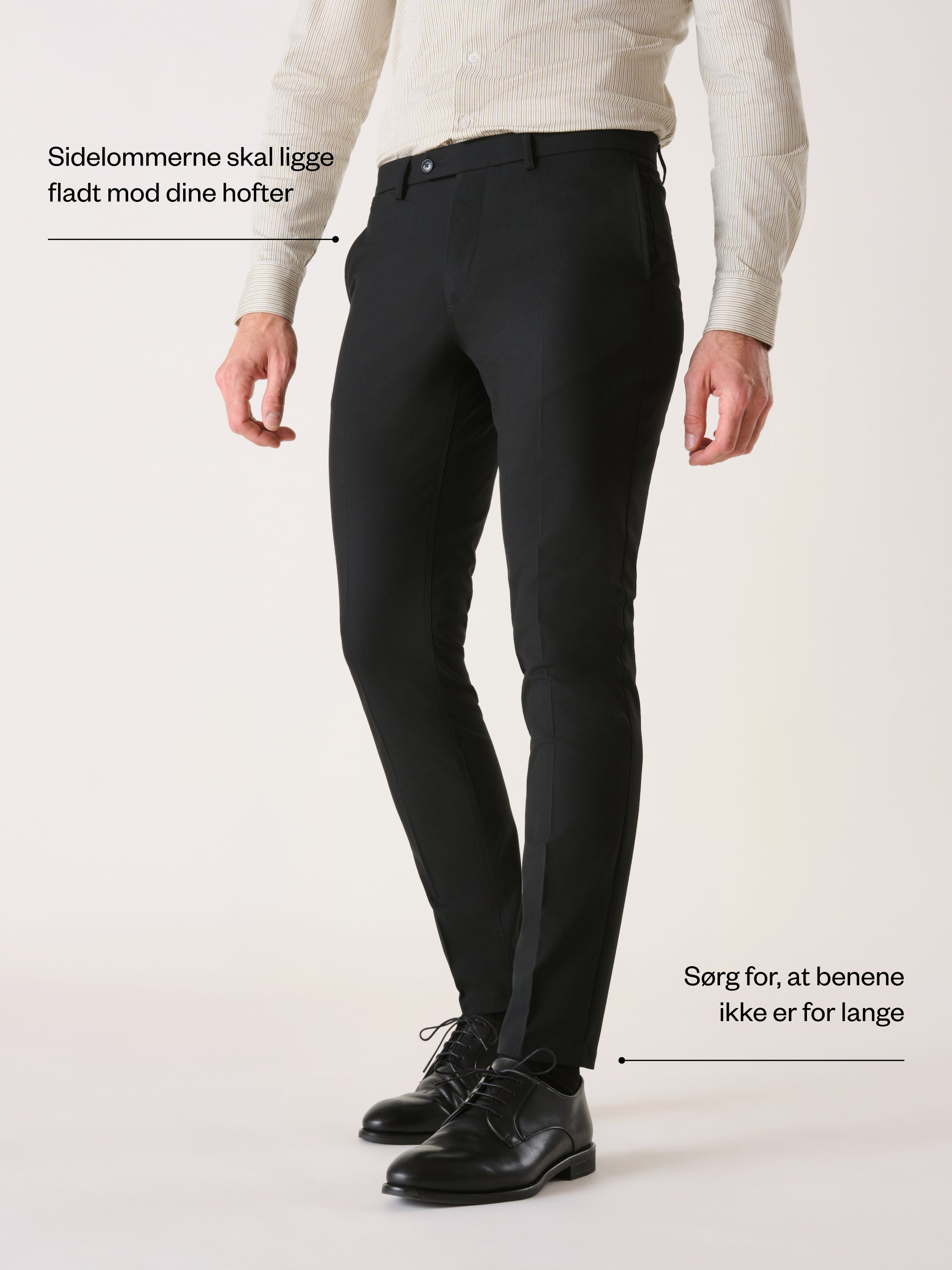 Vil du gerne se smart og sofistikeret ud? Så sørg for at dine bukser lægger sig pænt på skoene med kun én fold. Ikke mere, ikke mindre. Hvis dine bukser er for lange, vil det hurtig se sløset ud. Og hvis de er cropped, så tag en bevidst beslutning om at vise dine strømper og sko. Det sidste tip her er dog ikke noget vi anbefaler, hvis du har en meget stram dresscode.