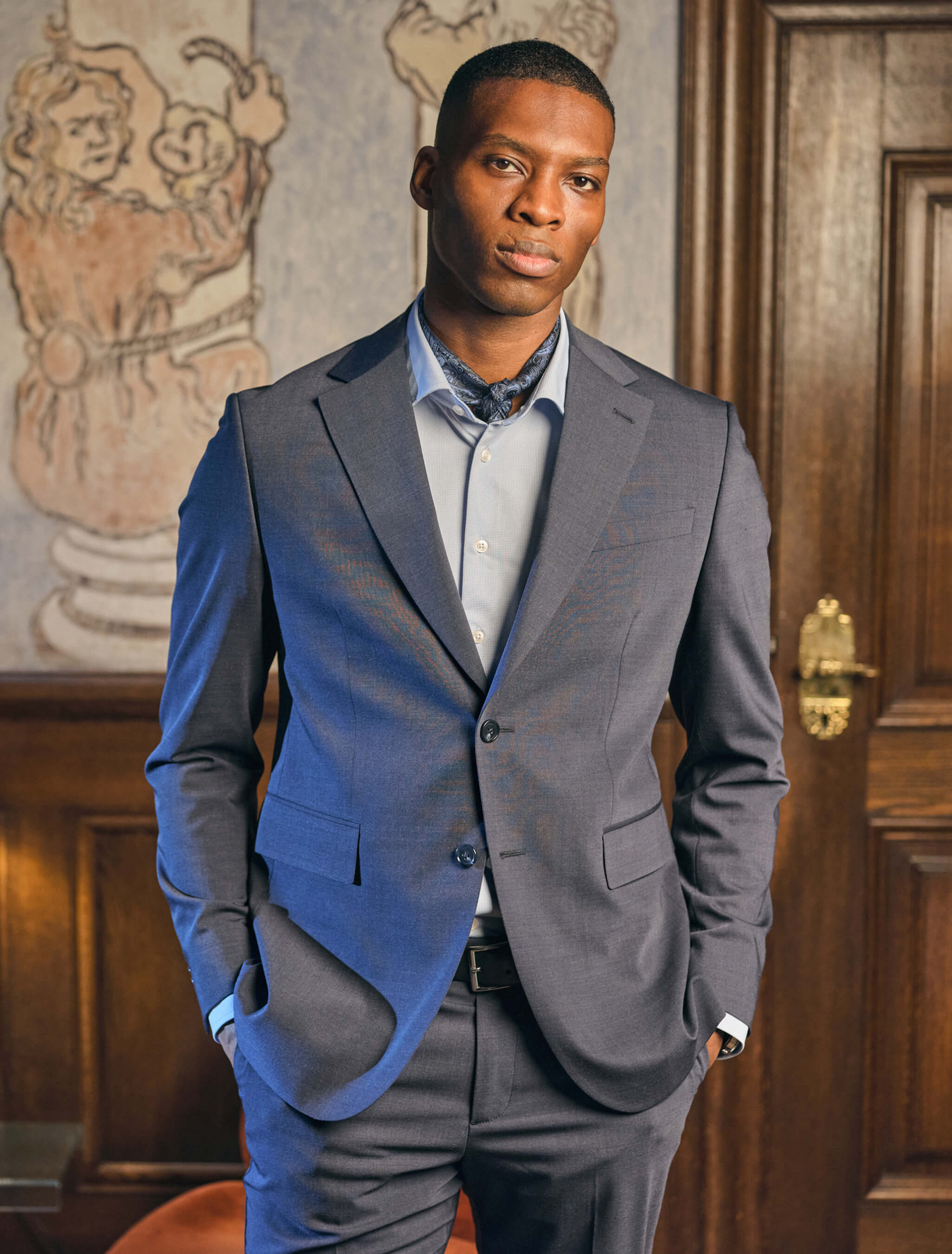 Velklædthed og bæredygtighed kan sagtens gå hånd i hånd. Vores jakkesæt til mænd er lavet af et teknisk og bæredygtigt materiale, som blandt andet er fremstillet af genanvendte plastikflasker.