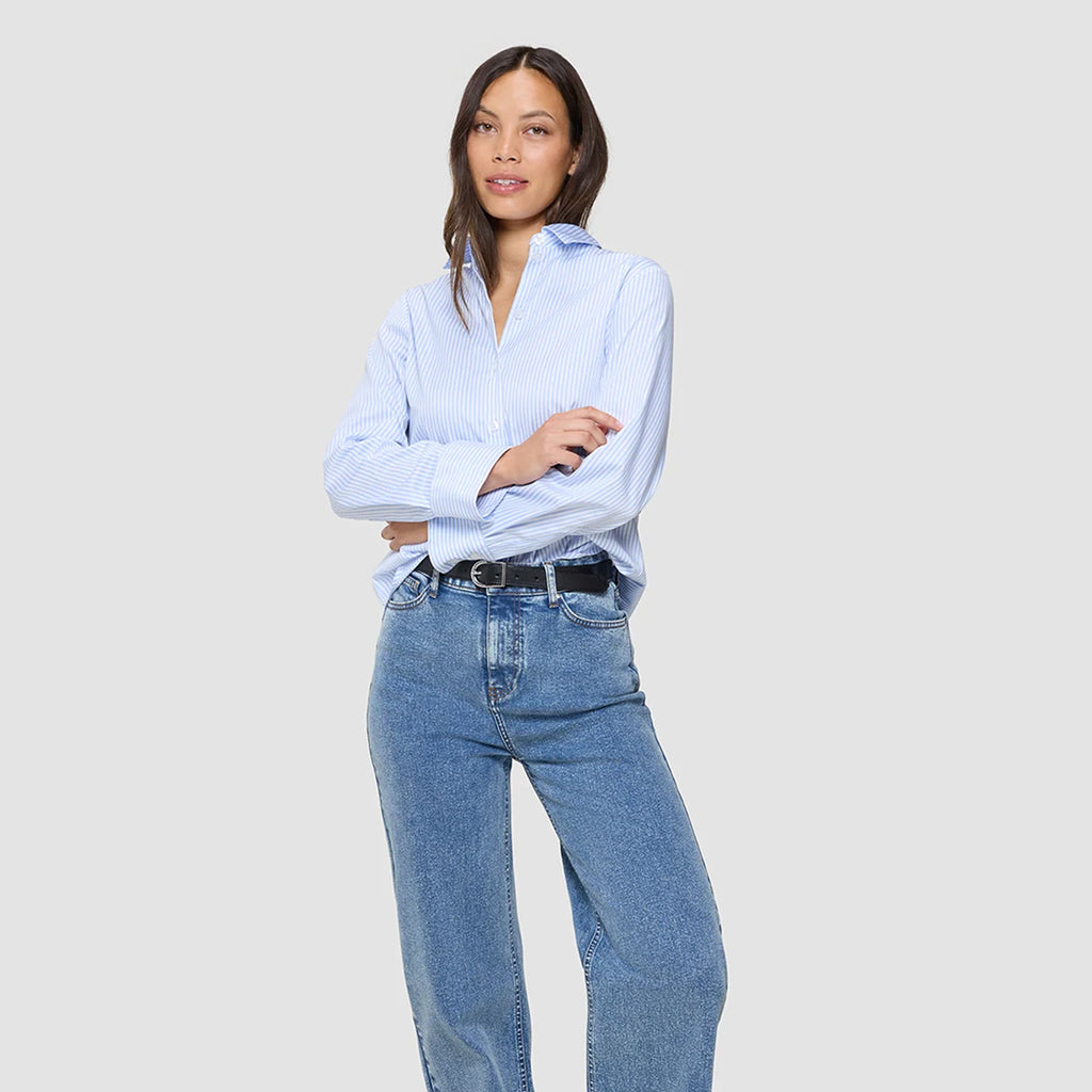 Vores straight fit jeans til kvinder udstråler diskret elegance. De er designet med en stilfuld høj talje og fås i flere forskellige tidløse farver. Uanset hvilken farve, du vælger, kan du style dine nye behagelige jeans med en enkel T-shirt og et par hvide sneakers for et afslappet udtryk eller skabe et mere stilrent look med en hvid oversized skjorte og stilfulde loafers.